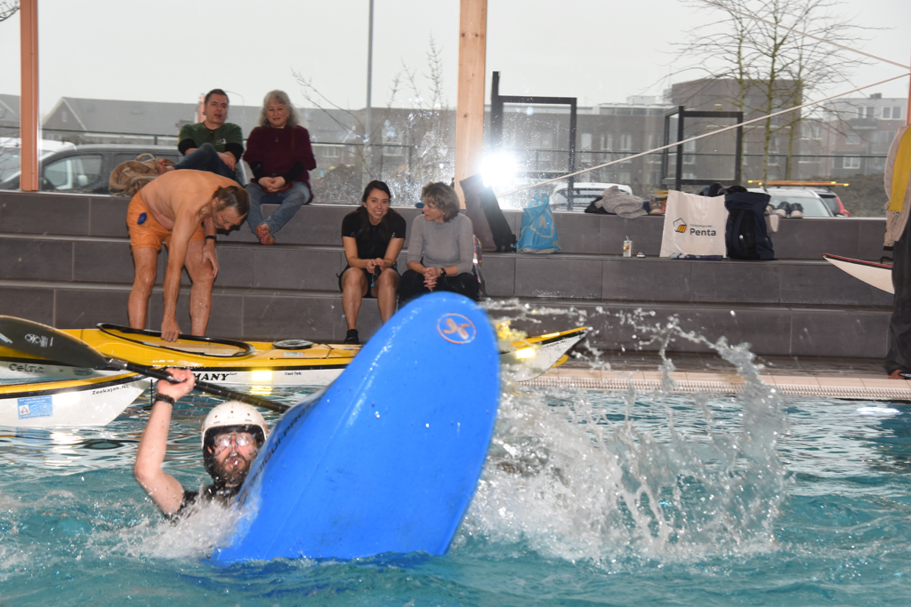 In het ruime zwembad kun je onder toezicht o.a. de demo zeekajaks van Nigel Dennis en Rockpool (Zeekajak.NL) en/of een C1 of wildwater bootje uitproberen of gewoon even spelen en oefenen. Er zijn voldoende kano’s, dus het is niet de bedoeling om hiervoor eigen kano’s mee te nemen.