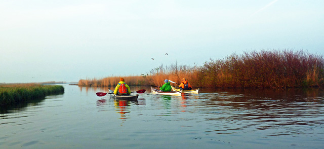 In deze omgeving gaan we peddelen. We kunnen ons verwonderen over de kleurenpracht van het landschap en het gekwetter van tientallen vogels.